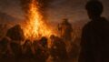 血の匂いに集まっていた小さな黒い影が、今度は炎に引かれるように軌道を変え、光の上で渦を描く。羽音は遠い潮騒に紛れ、いつしか祈りの囁きに変わっていった。